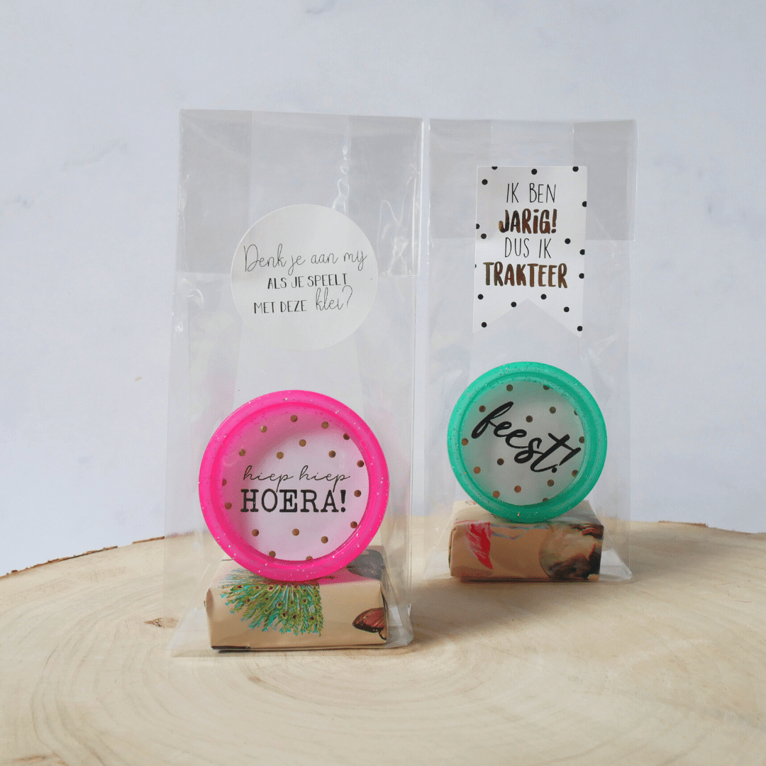 Traktatie klei is een super leuke traktatie voor zowel jongens als meiden. De klei is van Play-doh en is verpakt in een klein potje met deksel. Door het potje droogt de klei niet uit en kan er veelvuldig mee gespeeld worden. Op de deksel van het potje klei past een sticker die je kunt uitkiezen naar keuze. De bestelling wordt verpakt in een cellofaanzakje met een lekker snoepje.