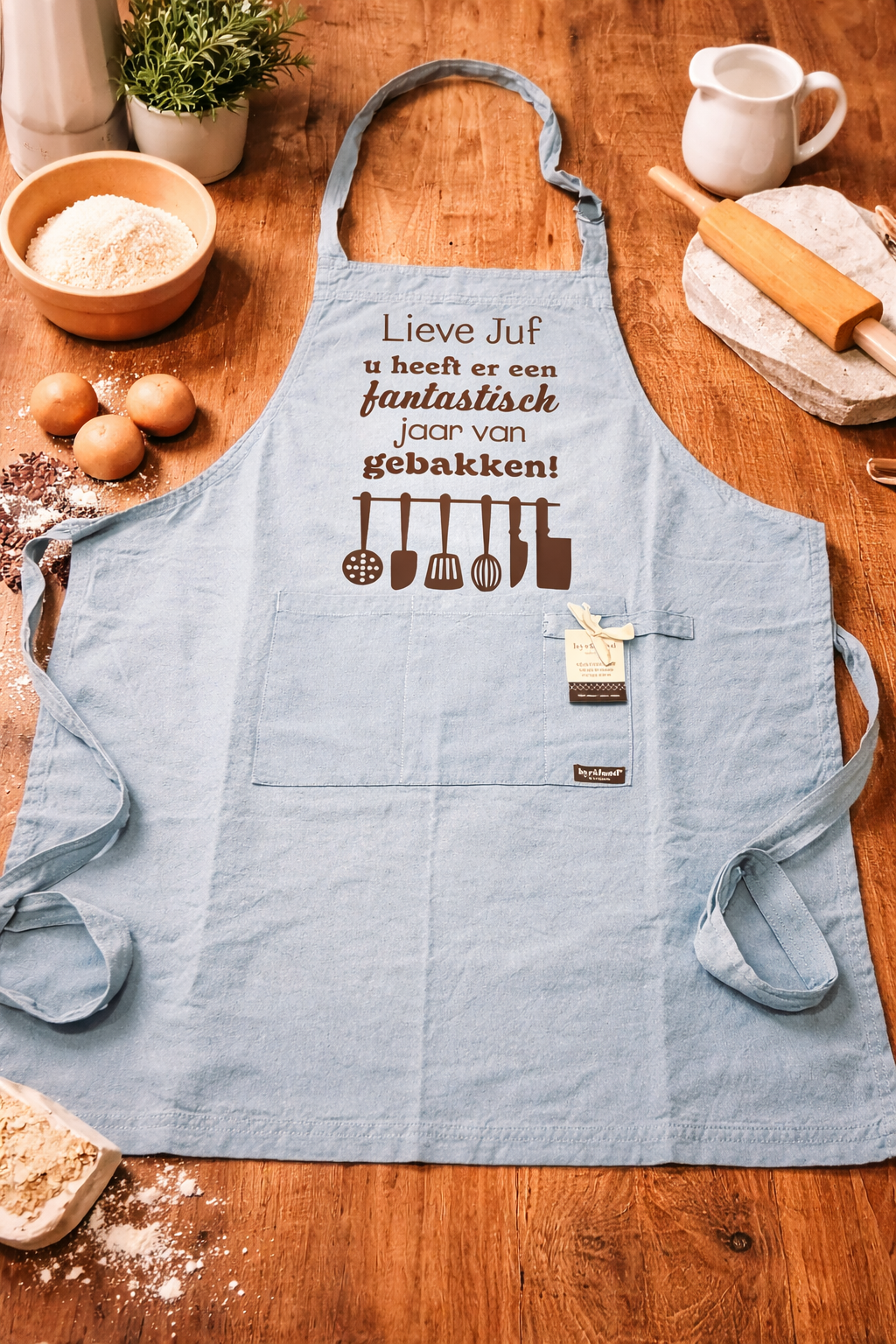 Kookschort voor de juf/ meester. Geef de juf en meester een origineel kado met dit mooie kookschort. Verkrijgbaar in grijs en blauw.