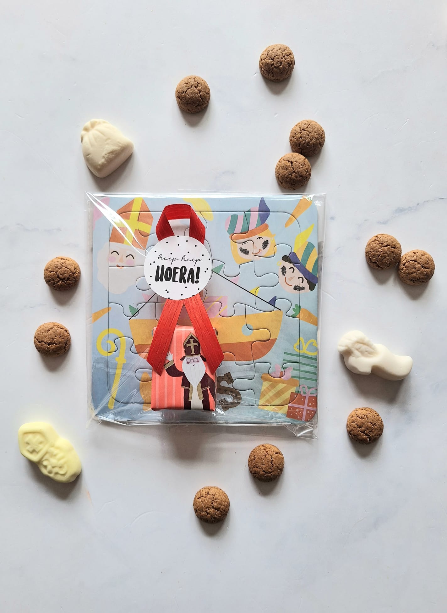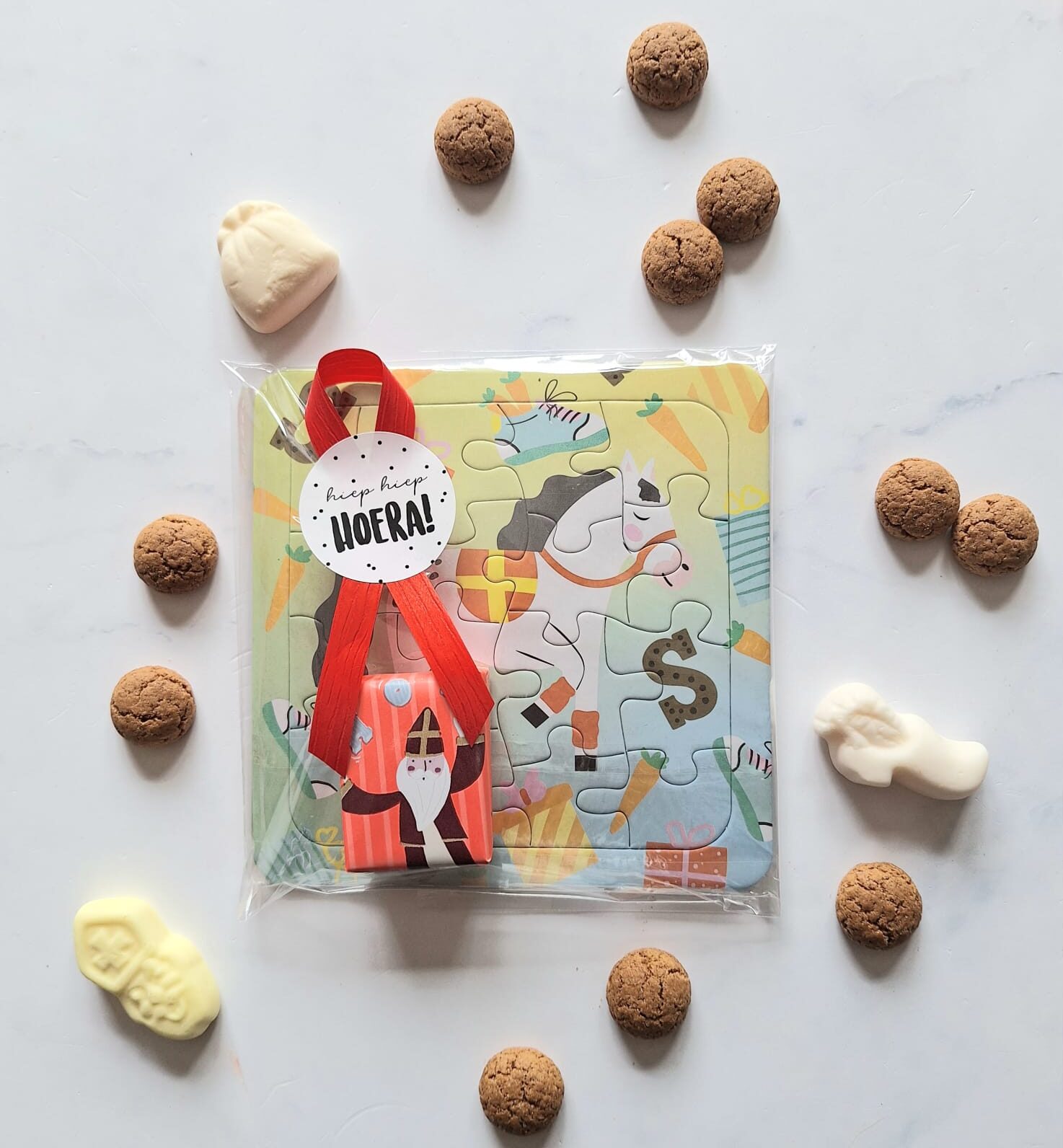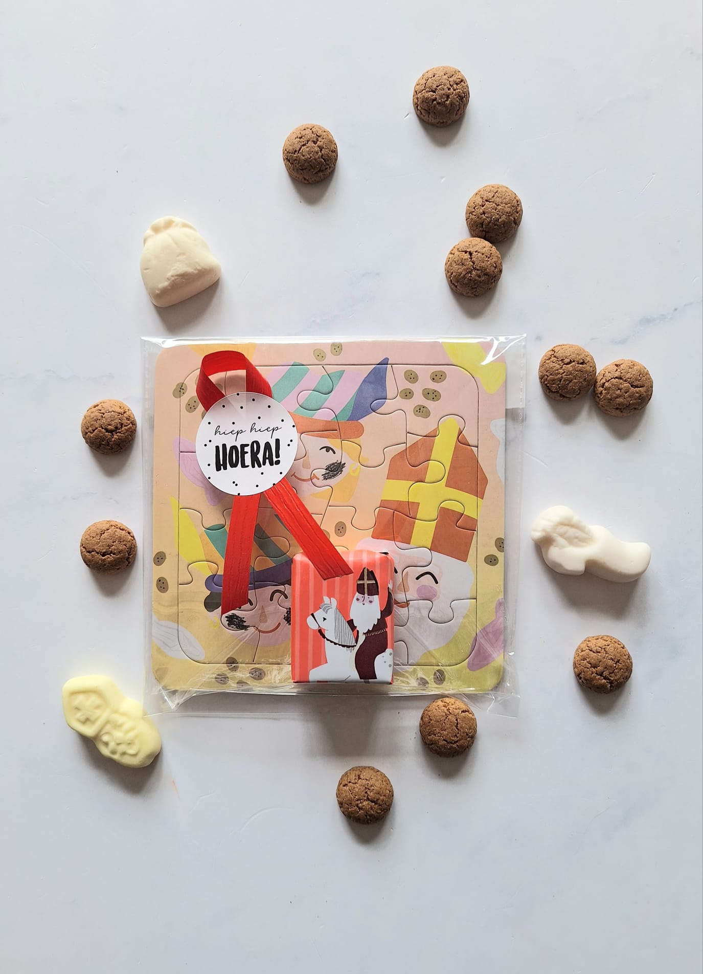 Elke puzzel bestaat uit 12 stukjes en bevat een heerlijk doosje rozijnen/smarties/lolly of kruidnootjes. De puzzel is feestelijk ingepakt in vrolijk Sinterklaaspapier en direct klaar om uit te delen als traktatie.
