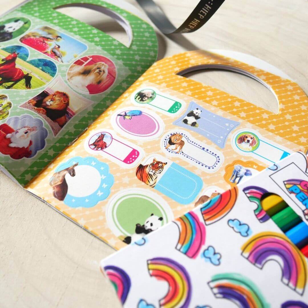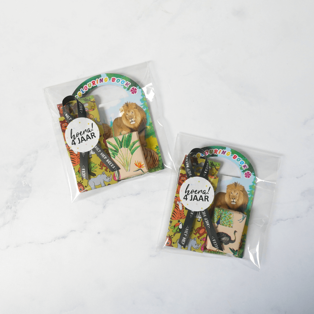 Wil jij graag een traktatie met kleurboek jungle trakteren? Deze kleurrijke traktatie maak je af door een zelfgekozen sticker en snoepje!