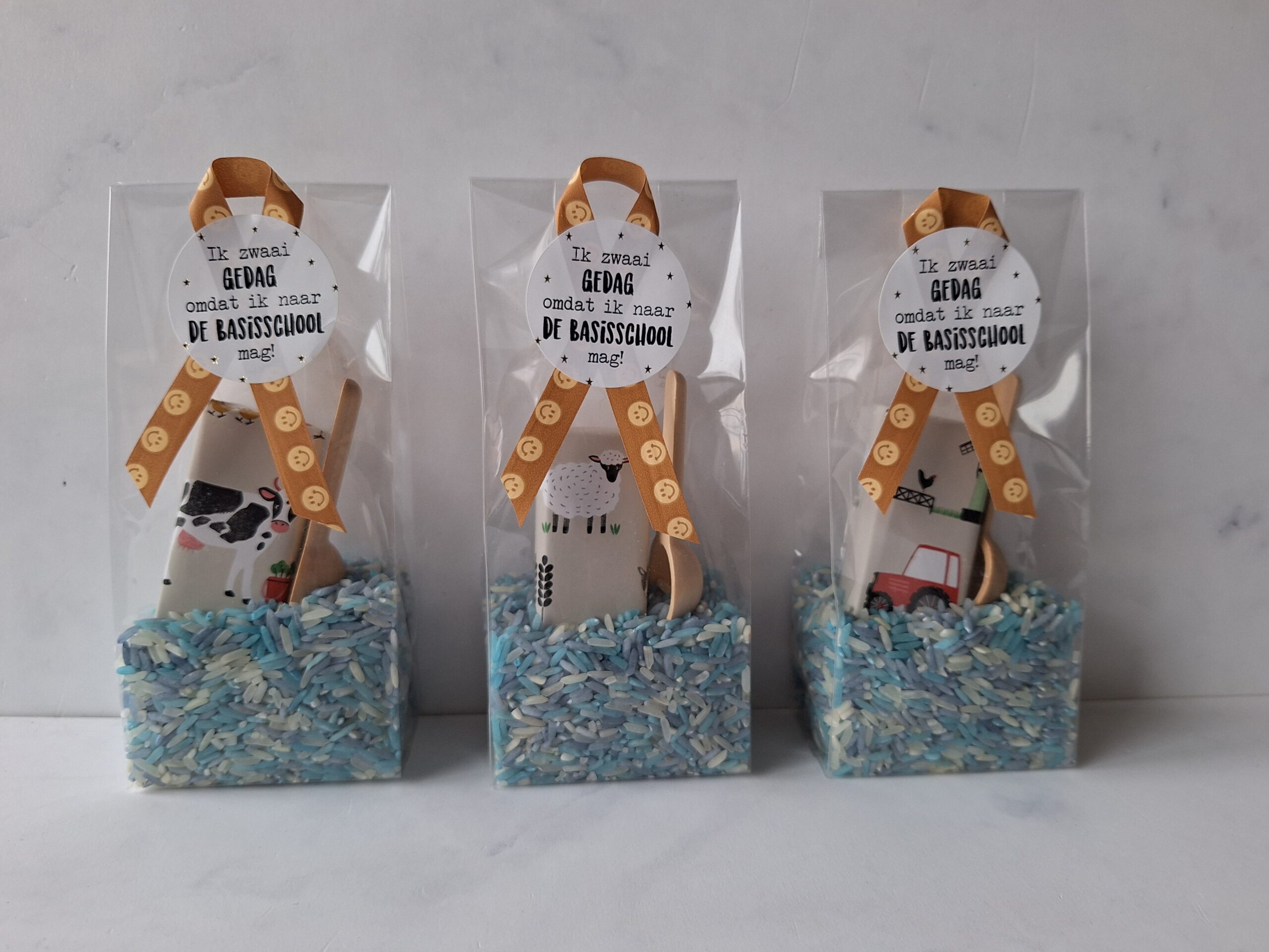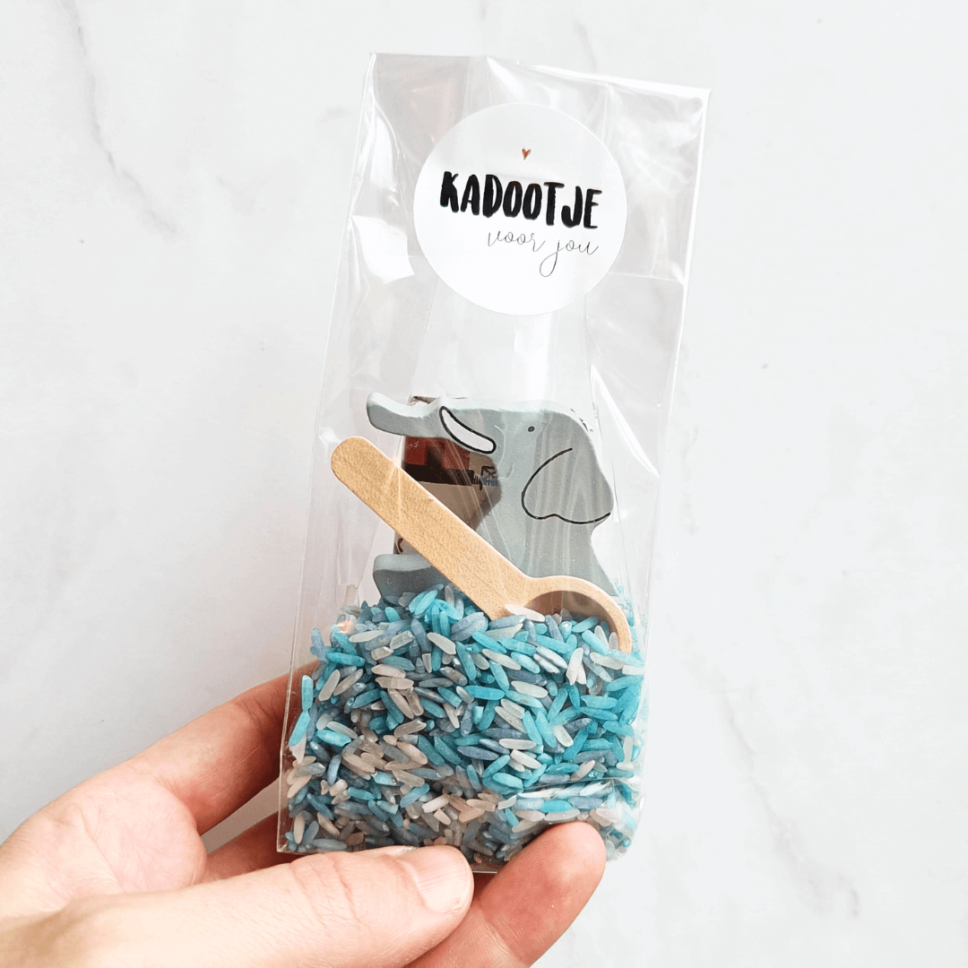 Traktatie speelrijst met houten schepje is een super leuke traktatie die verpakt zit in een mooi doosje. Het is een heel lief setje goed voor uren speelplezier! Leuk voor kinderen vanaf ongeveer 3 jaar tot en met 6 jaar. Uiteraard kun je zelf kiezen welk snoepje en sticker je bij de traktatie doet. De traktatie is ook beschikbaar in twee verschillende samenstellingen. Een blauwe kleur rijst of een geel met roze kleur. Je kunt ook een diertje bij je traktatie geleverd krijgen, deze kun je er optioneel bij bestellen in de keuzes hieronder.